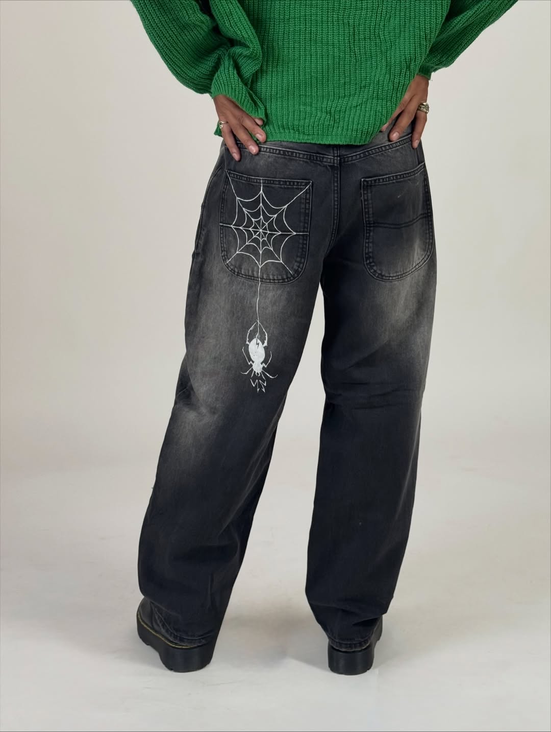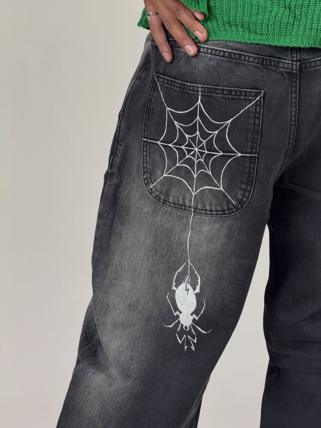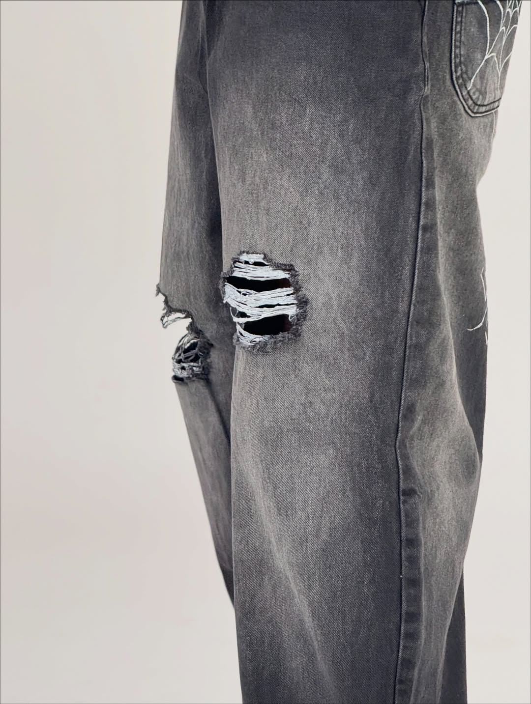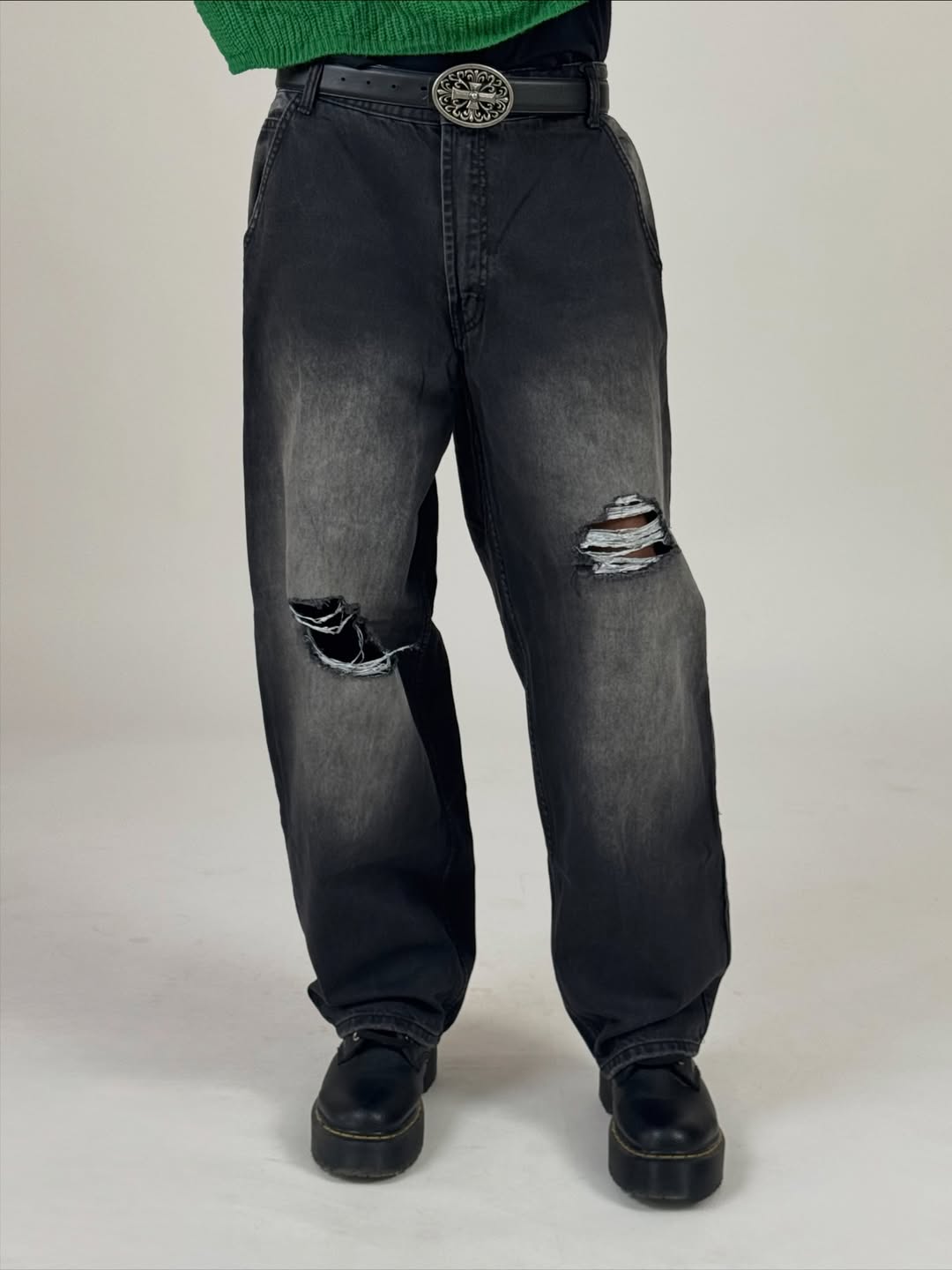 Black-wash baggy jeans with heavy fade detailing and ripped knee distressing for a bold, worn-in look. Relaxed fit with a street-ready silhouette—made to turn everyday outfits into statement fits.