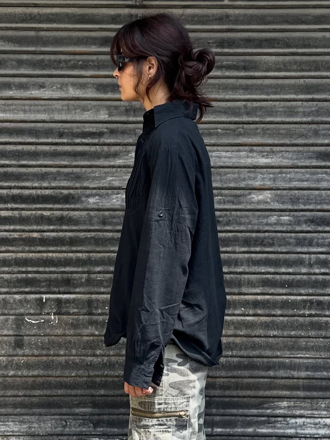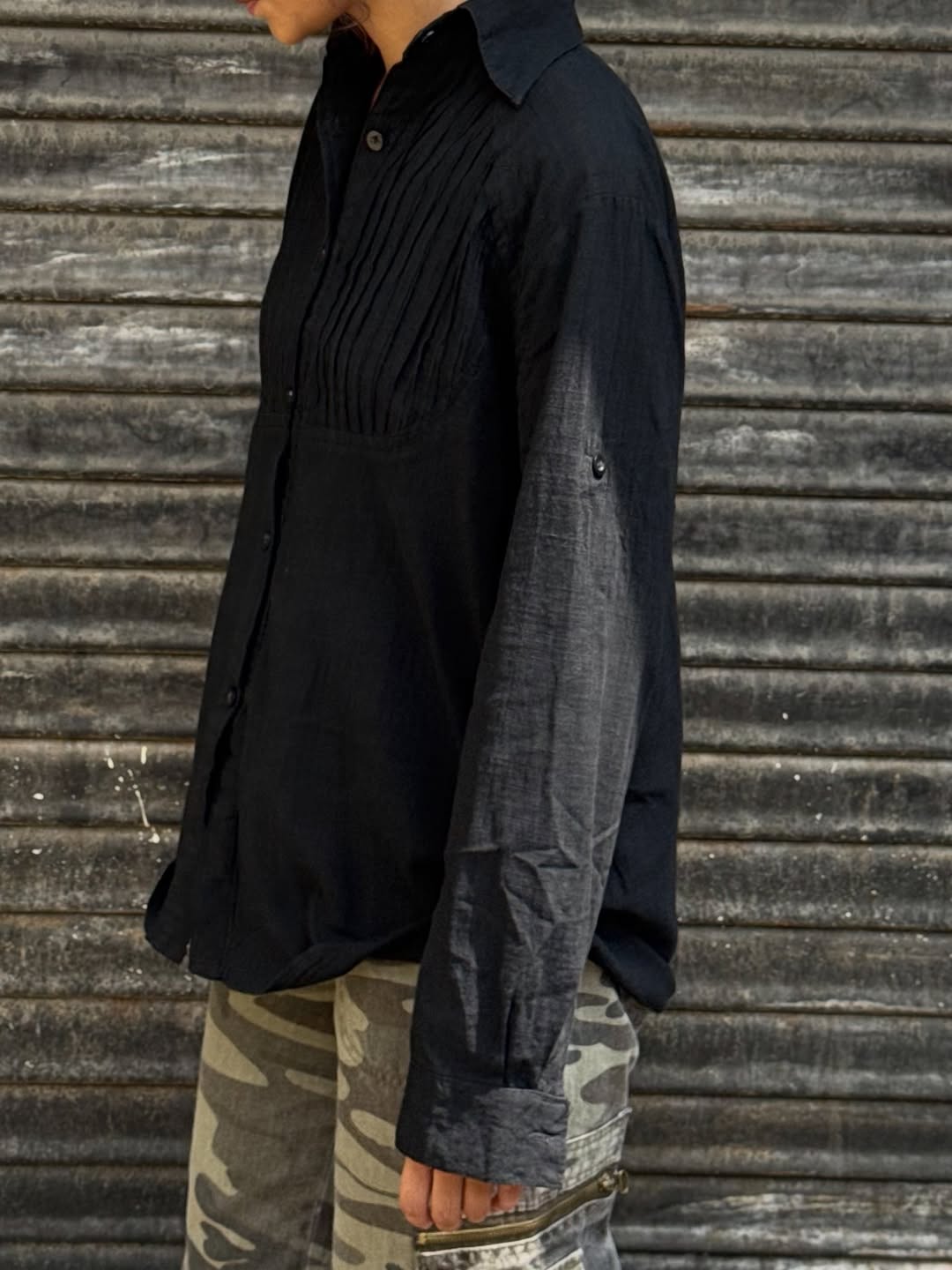 Sleek black button-up with a soft, flowy drape and minimal tuxedo-style detailing. Designed for a relaxed, androgynous fit that moves effortlessly between casual and elevated looks. A timeless wardrobe essential with quiet edge energy.