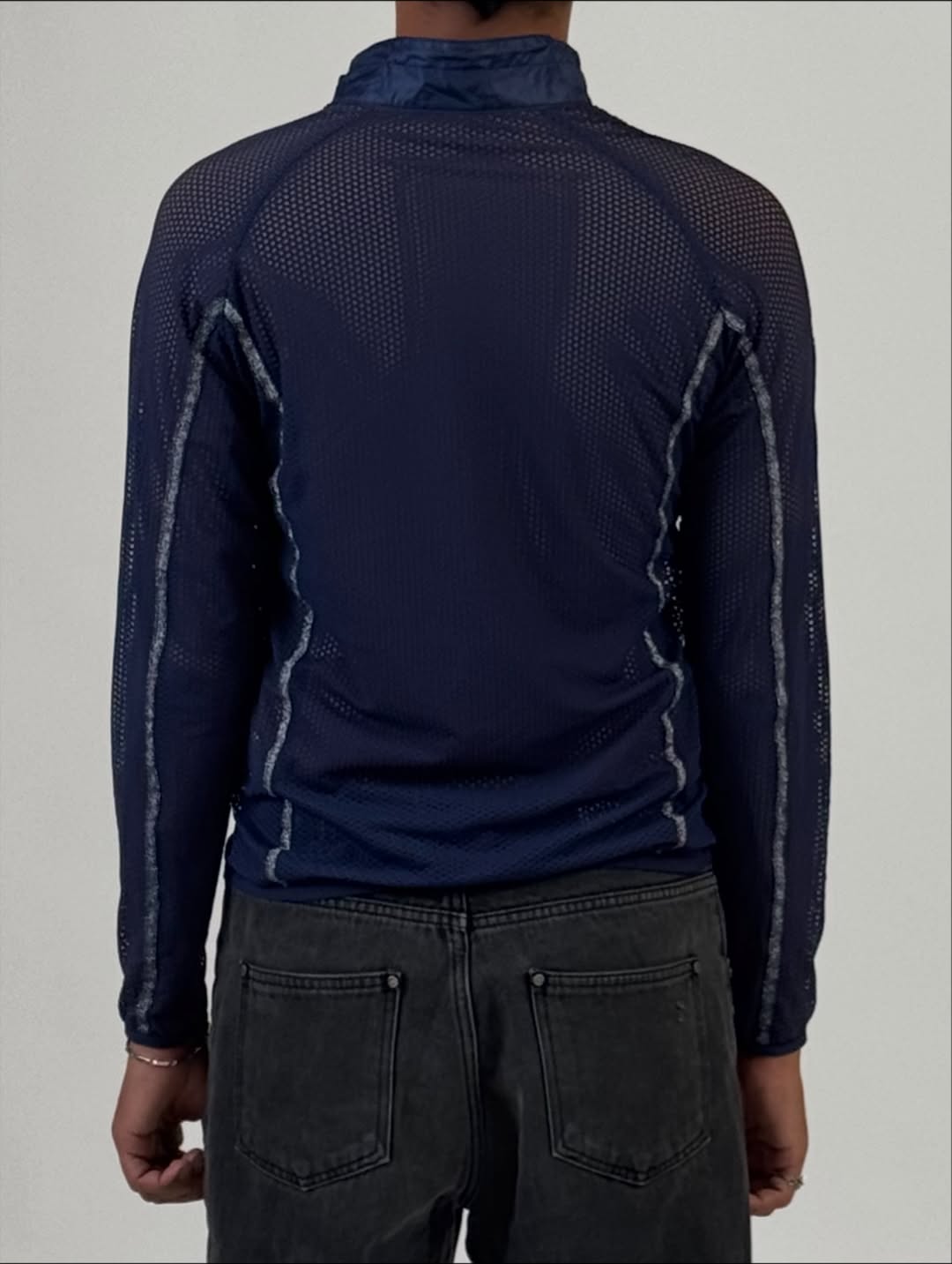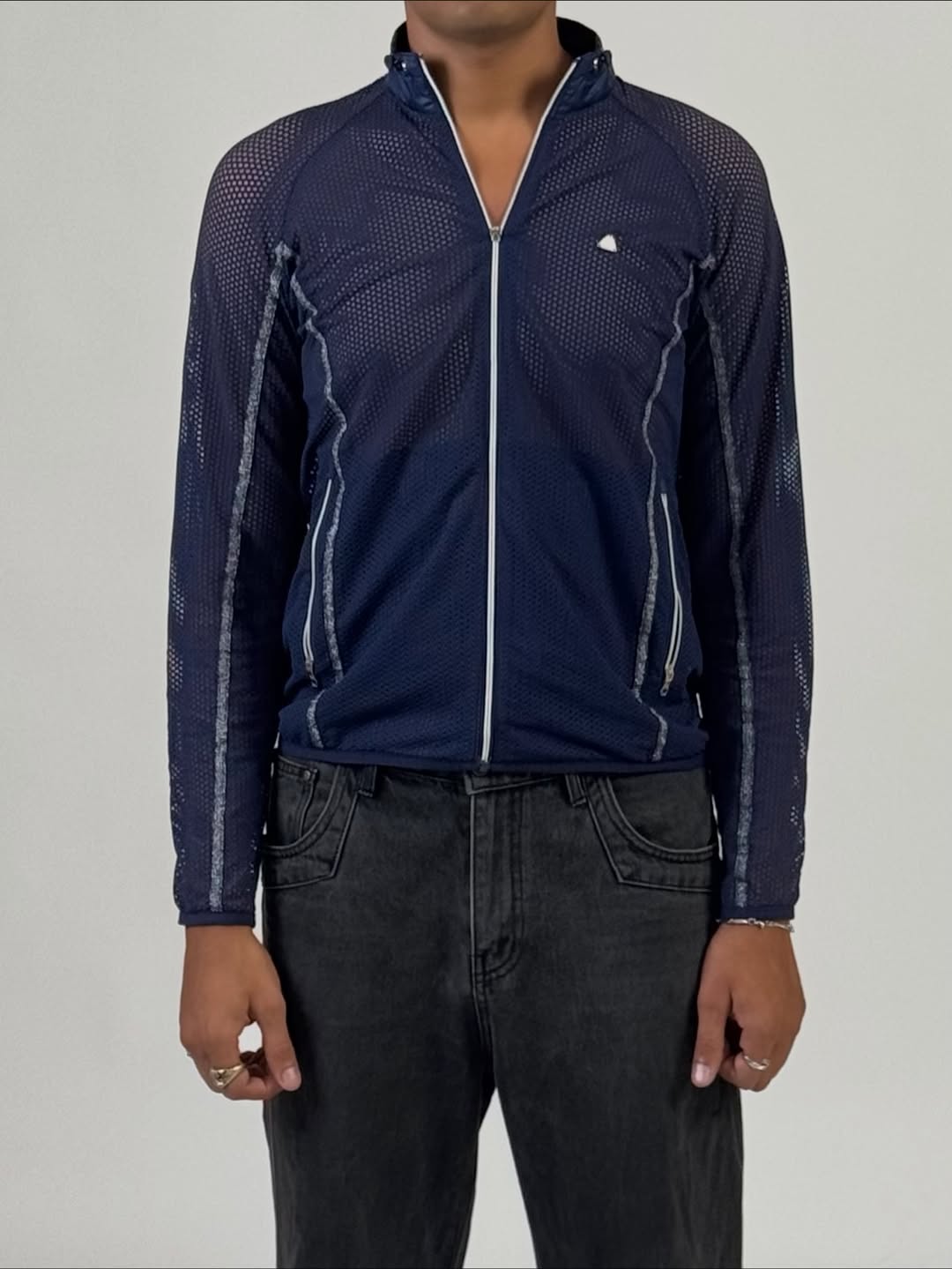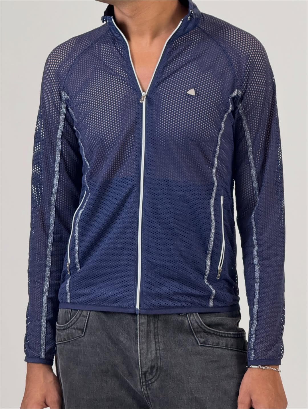Lightweight athletic performance jacket, designed with full mesh ventilation for training, running, or cycling. The material is a breathable, perforated synthetic fabric meant to keep the body cool during intense activity.